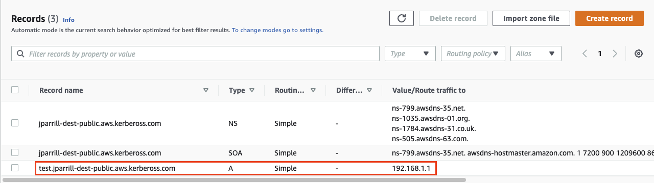 - In the main domain, create the NS record to redirect the DNS requests to that delegated zone (use the values from the previous step)